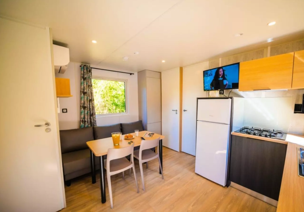 Pour vous retrouver, vous aurez une pièce à vivre avec espace repas, banquette (convertible en lit), télévision et kitchenette toute équipée : plaques de cuisson, réfrigérateur, lave-vaisselle, micro-onde, etc.